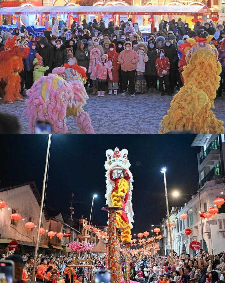 拼版照片:上圖為市民在沈陽新春皇寺廟會(huì)上觀看舞獅表演(2023年1月23日新華社記者楊青攝)。下圖為人們在馬來西亞檳城廟會(huì)上觀看舞獅表演(2025年2月1日新華社發(fā)李奕慧攝)。