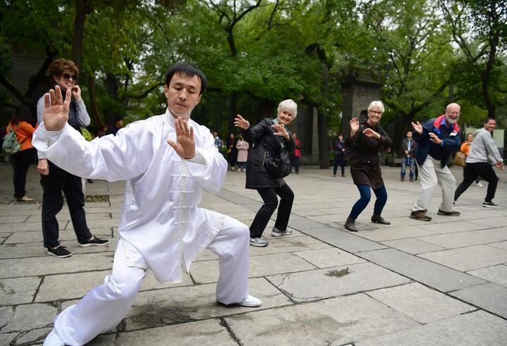 這是西安“80后”小伙趙慶(前)在小雁塔景區(qū)內(nèi)向外國游客教授楊氏太極拳動(dòng)作。新華社記者邵瑞攝