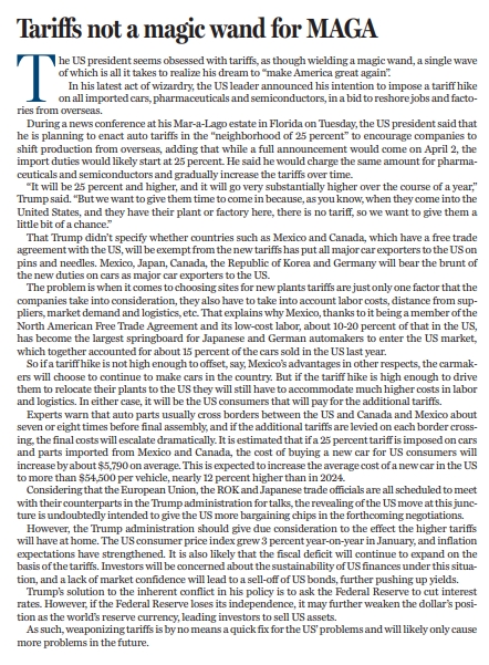 但是,特朗普政府也應(yīng)該充分考慮高額關(guān)稅將給其國(guó)內(nèi)帶來(lái)的影響。美國(guó)1月CPI同比增速升至3%,通脹預(yù)期不斷加強(qiáng)。在加征關(guān)稅的基礎(chǔ)上,美國(guó)的財(cái)政赤字很可能將持續(xù)擴(kuò)大。在這種情況下,投資者將對(duì)美國(guó)財(cái)政的可持續(xù)性產(chǎn)生擔(dān)憂,而市場(chǎng)信心缺失會(huì)導(dǎo)致美債被拋售,從而進(jìn)一步推高收益率。