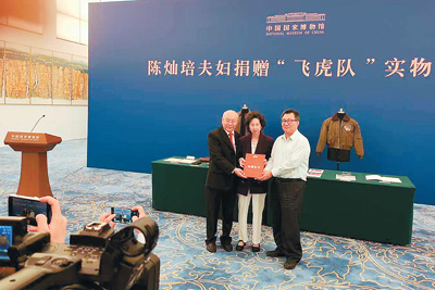 陳燦培夫婦(左一、左二)向中國國家博物館捐贈飛虎隊(duì)文物?! ∈茉L者供圖