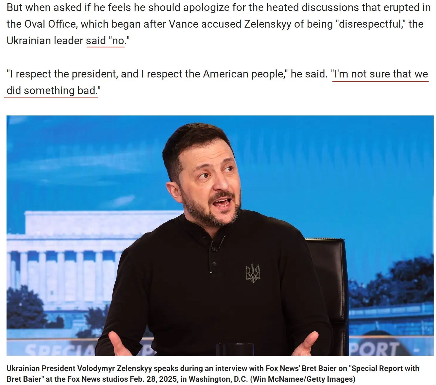 “我在橢圓形辦公室看到的是(澤連斯基對美國的)不尊重。我不知道我們能不能與澤連斯基恢復(fù)談判。還是那句話,他要么辭職,然后派一個可以與我們合作的人過來,要么他自己做出改變?!?/p>