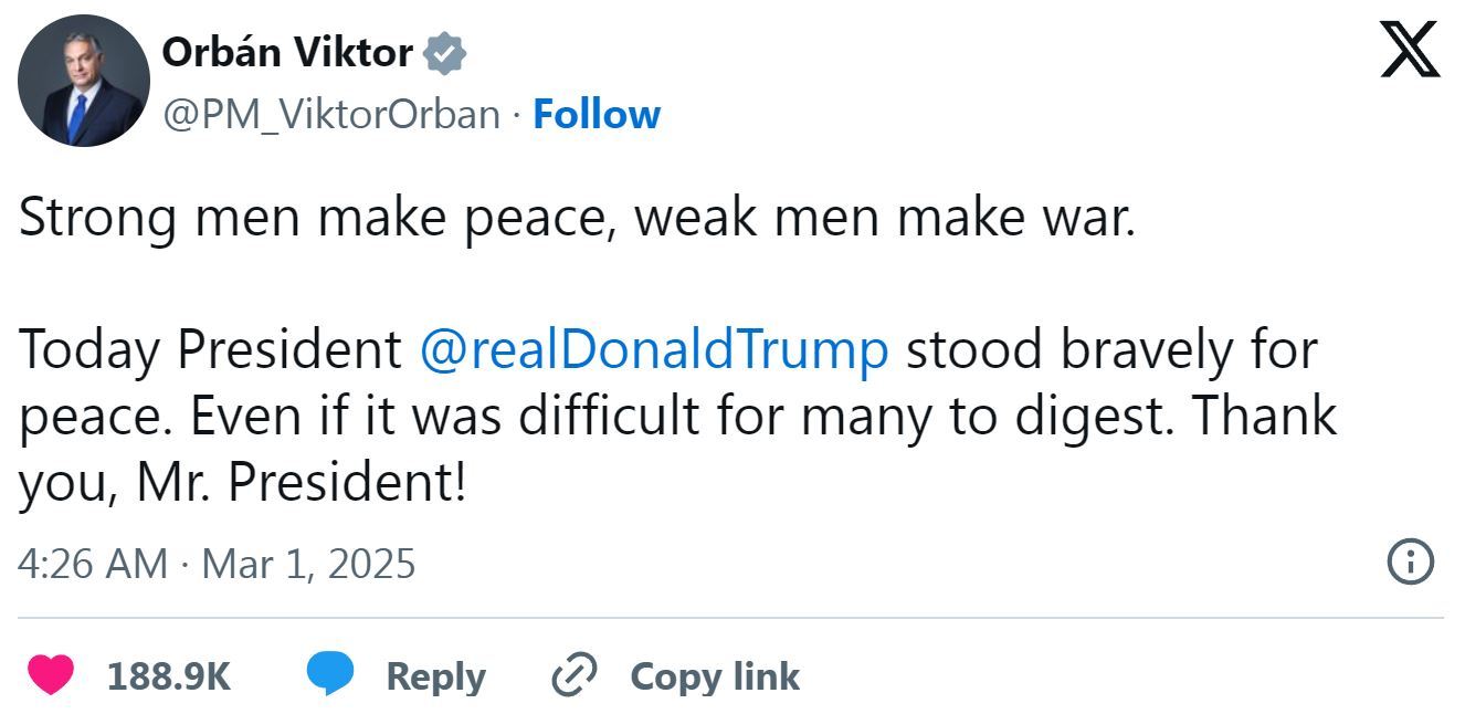 一向和歐洲“主流意見”唱反調(diào)的匈牙利總理歐爾班就對特朗普此次的表現(xiàn)大加贊賞。