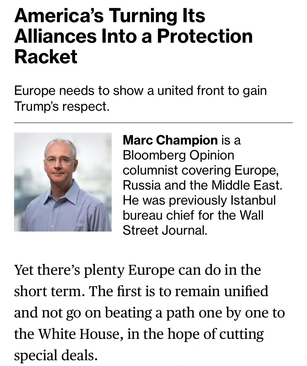 在彭博社專欄作家馬克·錢皮恩看來,特朗普政府奉行的“美國優(yōu)先”政策導(dǎo)致跨大西洋關(guān)系裂痕不斷加深。歐洲領(lǐng)導(dǎo)人應(yīng)保持團(tuán)結(jié),而不是一個接一個前往白宮,希望與美達(dá)成特殊協(xié)議。