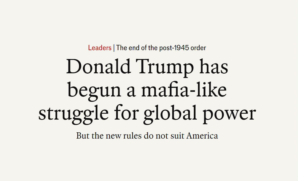 英國《經(jīng)濟學人》網(wǎng)站近期刊文稱,美國總統(tǒng)特朗普已經(jīng)開啟一場黑手黨式的全球權力爭奪。1945年后建立的世界秩序正在加速撕裂。一個強權即公理、小國受欺負的世界正快速到來。文章摘要如下: