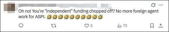 “哦豁!‘獨(dú)立智庫’的資金被切斷啦?ASPI這下做不成外國代理人的勾當(dāng)咯?!?/p>
