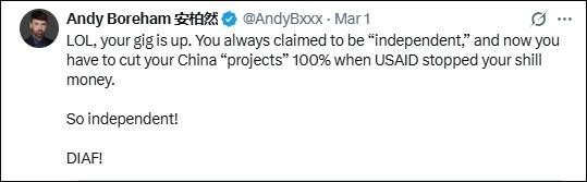 “笑死,你們?nèi)嗽O(shè)崩了?!痹谥袊詈凸ぷ鞫嗄甑男挛魈m媒體人安迪·博勒姆(中文名安柏然)也嘲諷道,“成天標(biāo)榜自己‘獨(dú)立’,現(xiàn)在美國國際開發(fā)署斷了黑錢,對華‘項(xiàng)目’得100%砍光。還真是獨(dú)立啊!趕緊涼透吧!”
