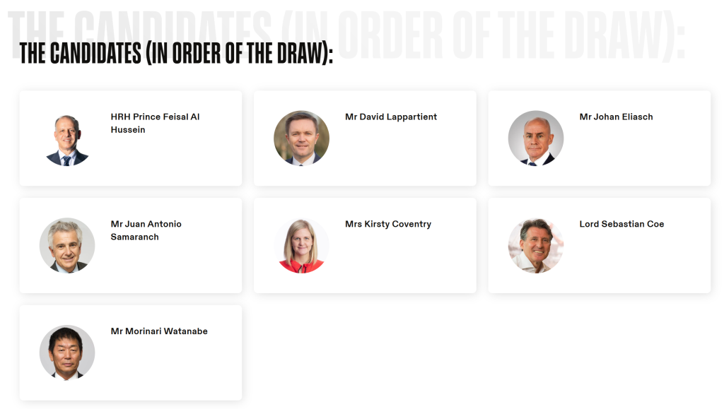 此次國際奧委會主席選舉共有創(chuàng)紀(jì)錄的七人參與,包括國際奧委會副主席小薩馬蘭奇,國際奧委會執(zhí)委、運動員委員會前主席柯絲蒂·考文垂,世界田聯(lián)主席塞巴斯蒂安·科,國際自行車聯(lián)盟主席大衛(wèi)·拉帕爾蒂安,國際雪聯(lián)主席約翰·埃利亞施,國際奧委會執(zhí)委費薩爾·侯賽因和國際體操聯(lián)合會主席渡邊守成。