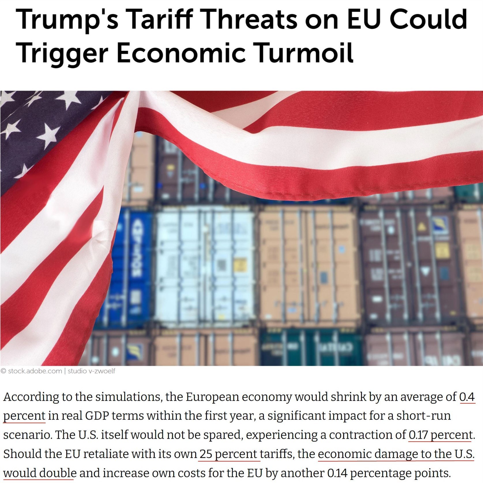 據(jù)德國基爾世界經(jīng)濟(jì)研究所此前推算,如果美國計(jì)劃中的關(guān)稅措施全部落地,歐盟和美國經(jīng)濟(jì)在第一年將分別萎縮0.4%和0.17%。如果歐盟以25%的關(guān)稅加以反制,美國的經(jīng)濟(jì)損失將翻倍。