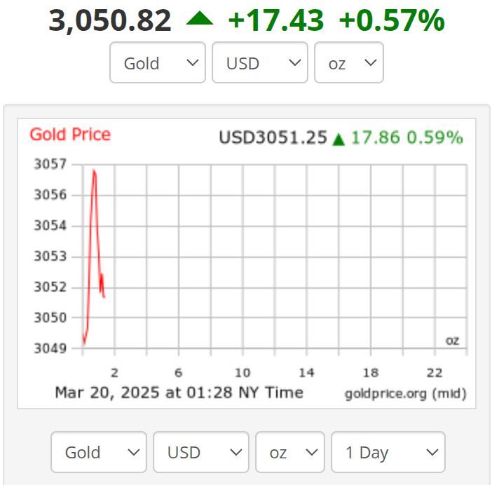 △當(dāng)?shù)貢r(shí)間20日開盤后,紐約商品交易所現(xiàn)貨黃金價(jià)格一度接近每盎司3057美元(圖自國際金價(jià)網(wǎng)站)