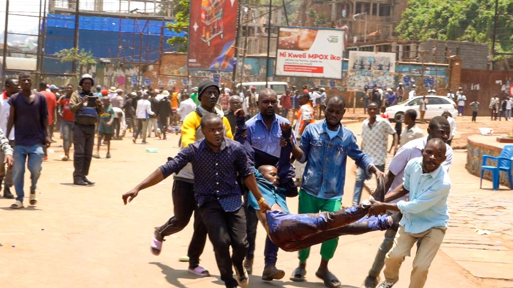 2月27日,剛果(金)東部南基伍省首府布卡武市發(fā)生兩起爆炸,造成至少11人死亡、65人受傷。圖為人們在爆炸事件現(xiàn)場搬運(yùn)傷員(視頻截圖)。新華社發(fā)
