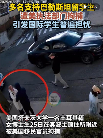 新華社北京3月28日電 據(jù)美國(guó)媒體報(bào)道,塔夫茨大學(xué)土耳其籍博士生魯梅伊莎·厄茲蒂爾克25日在其波士頓住所附近遭美國(guó)移民官員拘捕。自唐納德·特朗普就任總統(tǒng)以來(lái),已有多名在美外國(guó)留學(xué)生因支持巴勒斯坦而遭拘捕或被驅(qū)逐出境。