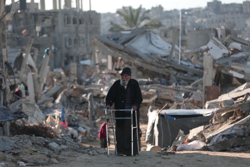 3月22日,一名從加沙地帶北部拜特拉希耶撤離的巴勒斯坦老人經(jīng)過(guò)加沙城。新華社發(fā)(阿卜杜勒·拉赫曼·薩拉馬攝)
