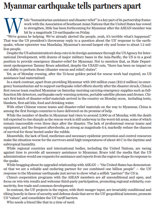 “人道主義援助和救災(zāi)”是美國與東盟伙伴關(guān)系的重要內(nèi)容,美國也信誓旦旦地宣稱要加強(qiáng)救援合作,但截至3月31日下午,緬甸地震72小時救援黃金時間已經(jīng)過去,緬甸當(dāng)?shù)厝晕闯霈F(xiàn)美國救援隊的身影。