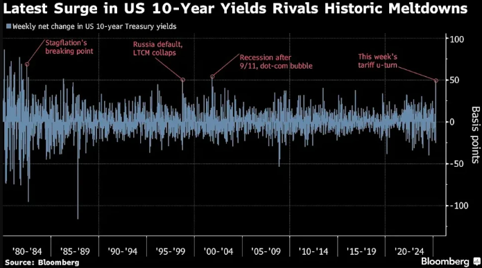 這一基準(zhǔn)收益率在過去短短五天內(nèi)飆升了逾50個(gè)基點(diǎn)至4.49%——上一次出現(xiàn)如此猛烈的單周漲幅,還要追溯到2001年“911”恐怖襲擊發(fā)生之時(shí)。