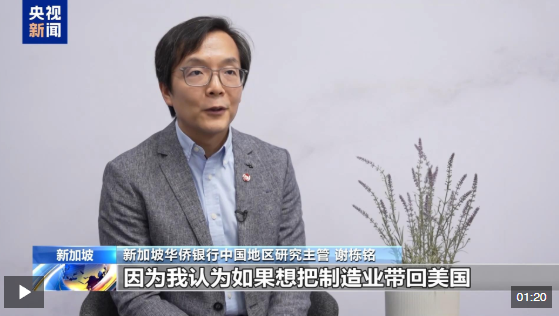 特朗普政府對(duì)全球貿(mào)易伙伴實(shí)施所謂的“對(duì)等關(guān)稅”,聲稱這是為了解決美國(guó)的貿(mào)易逆差并推動(dòng)制造業(yè)回流。新加坡華僑銀行中國(guó)地區(qū)研究主管謝棟銘在接受總臺(tái)記者采訪時(shí)表示,特朗普所謂的“對(duì)等關(guān)稅”無(wú)法真正實(shí)現(xiàn)這些目標(biāo)。
