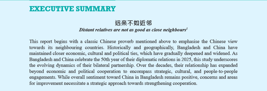 報告說,75%的受訪者對孟加拉國與中國的關(guān)系持正面看法,與此同時,僅2%的受訪者對華關(guān)系持負面看法。