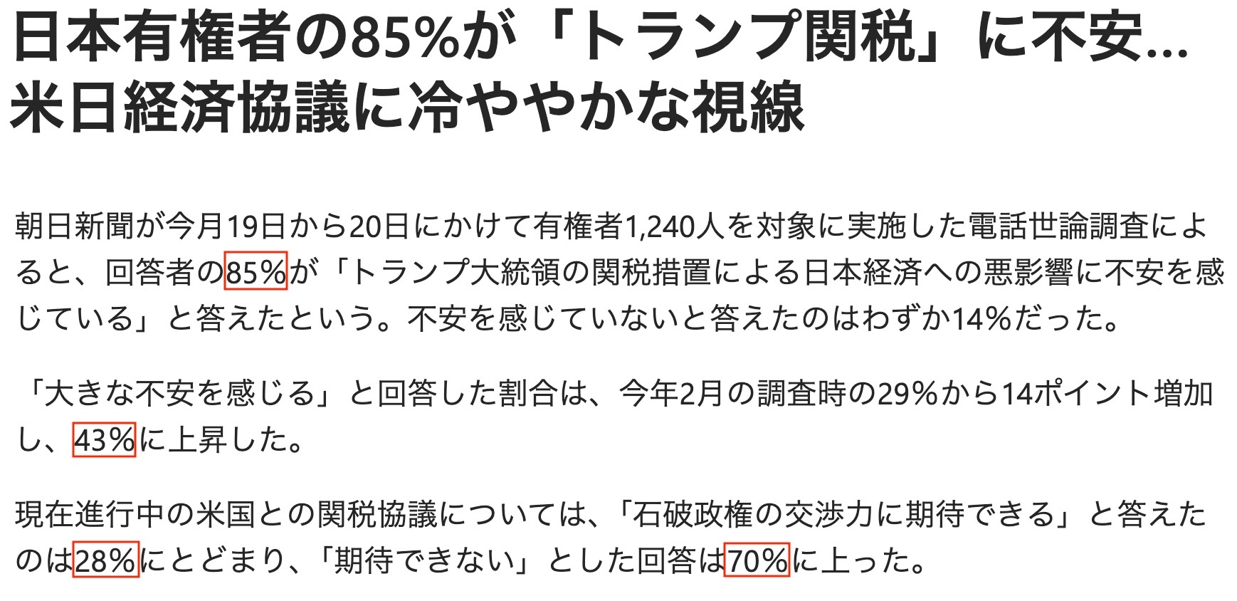 此外,多達(dá)70%的受訪(fǎng)者對(duì)日本政府與美國(guó)政府就關(guān)稅問(wèn)題進(jìn)行的交涉不抱期待。
