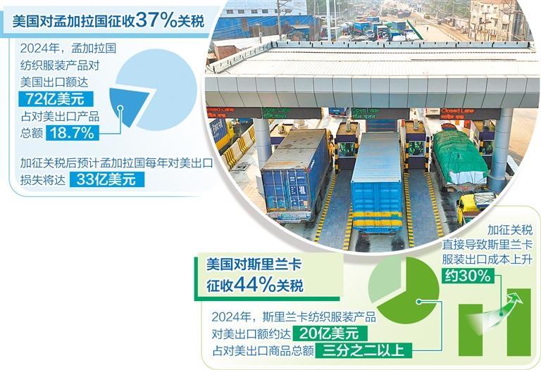 孟加拉國經(jīng)濟高度依賴紡織服裝產(chǎn)品出口,美國是孟加拉國除歐盟外的第二大出口市場。作為全球第二大服裝產(chǎn)品出口國,2024年,孟加拉國紡織服裝產(chǎn)品對美國出口額達到72億美元,占對美出口產(chǎn)品總額的18.7%。美國所謂“對等關稅”生效后,直接沖擊孟加拉國紡織服裝出口領域,使出口成本大幅增加,嚴重削弱了孟加拉國產(chǎn)品的價格競爭力。在此背景下,預計孟加拉國每年對美出口損失將達到33億美元。此外,近期印度政府宣布不再允許孟加拉國經(jīng)印度陸地海關對第三國出口貨物,此舉將在短期內(nèi)進一步推高孟加拉國貨物出口成本。
