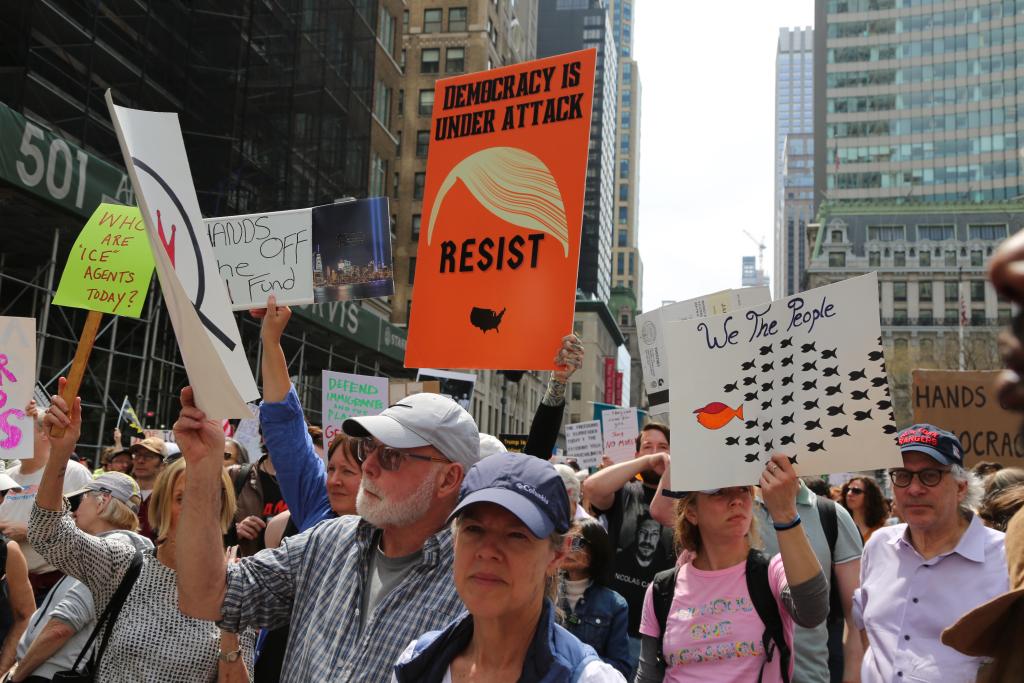 4月19日,人們在美國紐約街頭參加抗議活動。美國多地19日舉行抗議活動,首都華盛頓、紐約、舊金山、波士頓等城市的民眾走上街頭,抗議現(xiàn)政府大規(guī)模裁員、加征關(guān)稅、驅(qū)逐移民等政策。新華社記者劉亞南攝