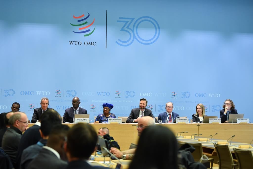 4月16日,在瑞士日內(nèi)瓦世界貿(mào)易組織總部,世貿(mào)組織總干事伊維拉(后排左四)出席新聞發(fā)布會。世界貿(mào)易組織16日發(fā)布的最新報告顯示,美國關(guān)稅政策導(dǎo)致全球貿(mào)易前景嚴(yán)重惡化。新華社記者連漪攝