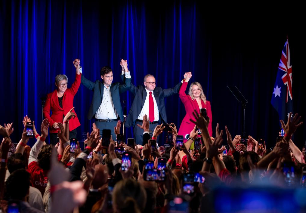 5月3日,在澳大利亞悉尼,澳大利亞總理阿爾巴尼斯(右二)與澳大利亞外長黃英賢(左一)在競選集會上慶祝勝利。新華社記者馬平攝