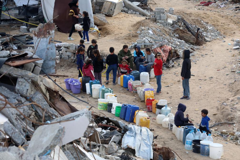 2月19日,在加沙地帶北部拜特哈嫩,兒童排隊(duì)等待取水。新華社發(fā)(里澤克·阿卜杜勒賈瓦德攝)