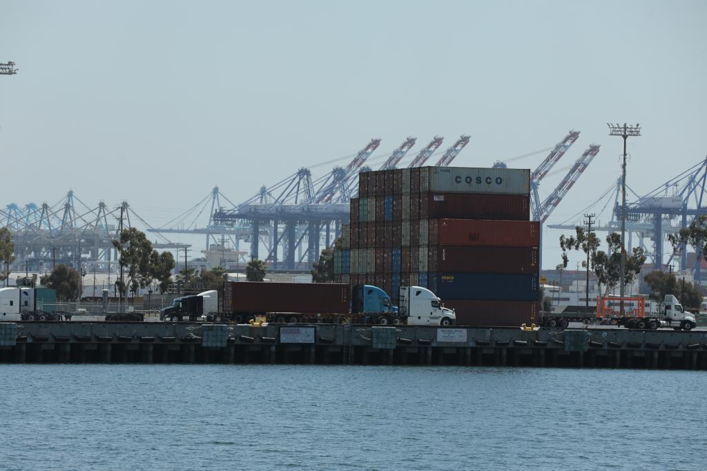 這是4月29日在美國洛杉磯港拍攝的集裝箱和卡車。洛杉磯港執(zhí)行董事吉恩·塞羅卡當(dāng)天表示,隨著美國關(guān)稅政策導(dǎo)致企業(yè)削減進(jìn)口訂單,洛杉磯港下周入境貨運(yùn)量預(yù)計將比去年同期下跌超過35%。新華社發(fā)(邱晨攝)