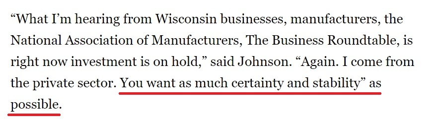 “我從本州的企業(yè)、制造商以及全美制造商協(xié)會和商業(yè)圓桌會議那里聽到的消息是,許多外商原定的投資計劃已經(jīng)被擱置。我本人來自私營企業(yè),我知道企業(yè)最需要的就是盡可能多的確定性和穩(wěn)定性?!?/p>