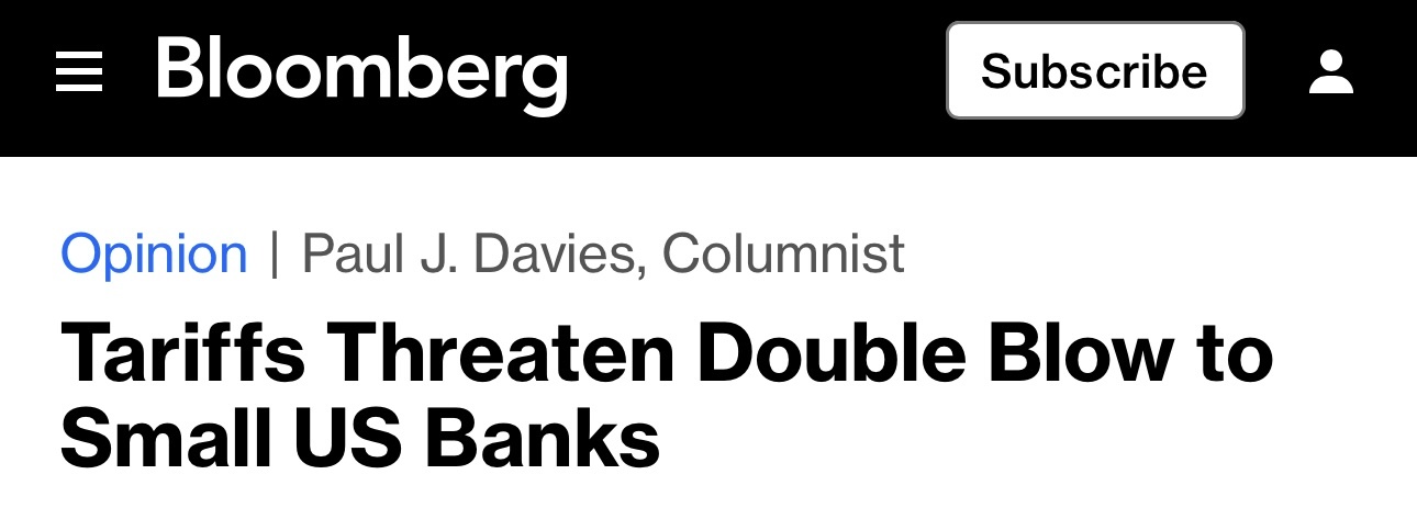 彭博社網(wǎng)站近日的一篇文章分析指出,關(guān)稅威脅對(duì)美國(guó)小型銀行造成雙重打擊。