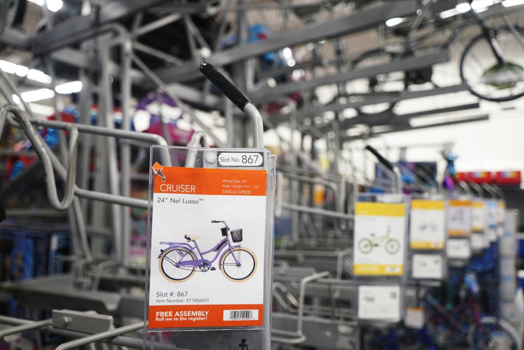 5月21日,在美國舊金山灣區(qū)圣利安卓San Leandro的一家沃爾瑪超市,價(jià)格跟蹤軟件(Walmart Tracker)顯示商品(中國產(chǎn)毛猴玩具)售價(jià)變化。新華社記者吳曉凌攝
