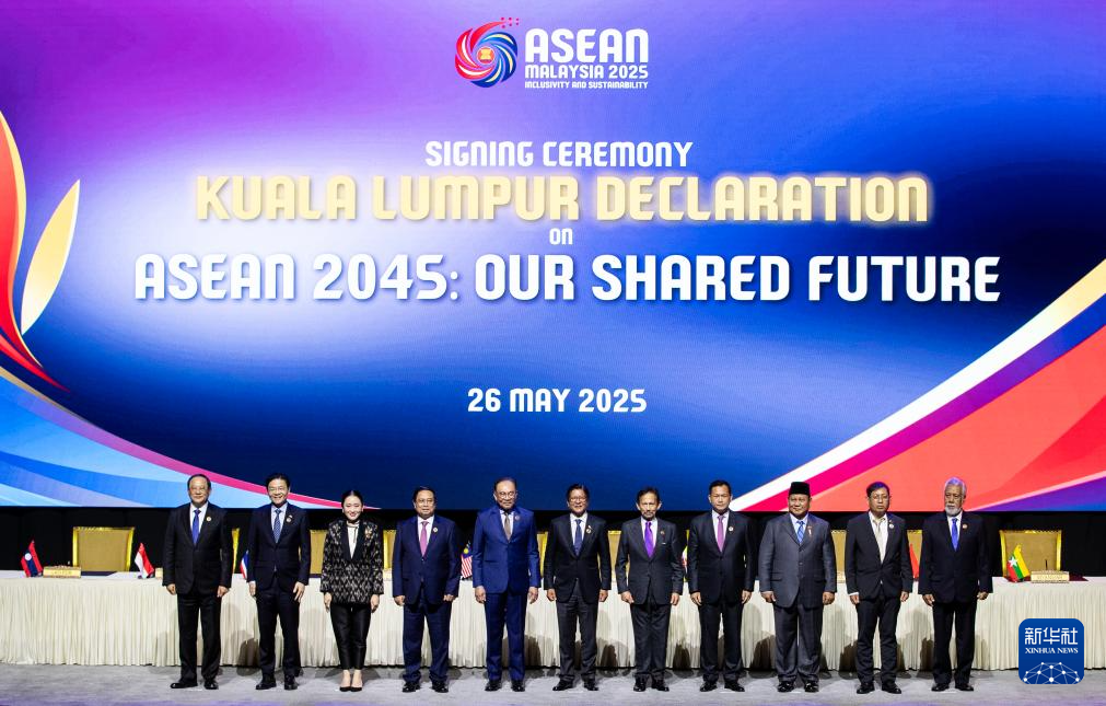 5月26日,在馬來西亞首都吉隆坡,老撾總理宋賽、新加坡總理黃循財、泰國總理佩通坦、越南總理范明政、馬來西亞總理安瓦爾、菲律賓總統(tǒng)馬科斯、文萊蘇丹哈桑納爾、柬埔寨首相洪瑪奈、印度尼西亞總統(tǒng)普拉博沃、緬甸外交部常秘昂覺莫、東帝汶總理夏納納(從左至右)在第46屆東盟峰會“吉隆坡宣言”簽署儀式上合影。新華社記者 馬平 攝