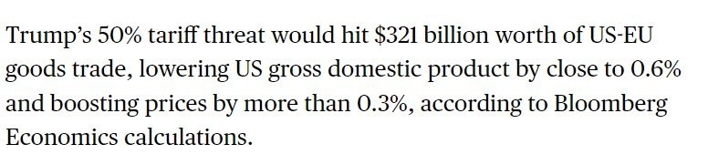 彭博社的計(jì)算結(jié)果顯示,50%的關(guān)稅將影響價值高達(dá)3210億美元的美歐商品貿(mào)易,一旦征收,將使美國國內(nèi)生產(chǎn)總值(GDP)下降近0.6%,物價上漲超過0.3%。