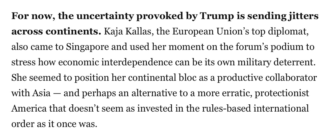 文章注意到歐盟外交與安全政策高級(jí)代表卡婭·卡拉斯的發(fā)言,稱她似乎將歐盟定位為亞洲富有成效的合作伙伴。她認(rèn)為,亞洲或許可以成為一種新選擇,以應(yīng)對(duì)美國(guó)如今的日益反復(fù)無(wú)常、奉行保護(hù)主義,以及不再重視基于規(guī)則的國(guó)際秩序。