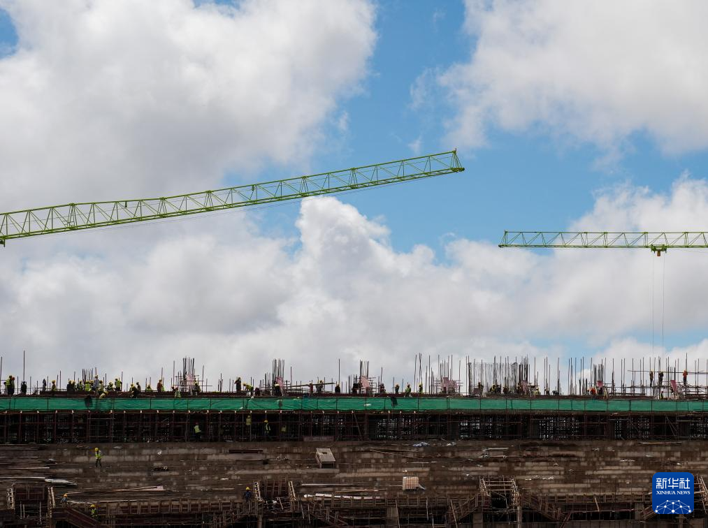 這是坦桑尼亞北部城市阿魯沙的一片繁忙工地:六座高聳的塔吊伸展著鋼鐵巨臂,在高空精準吊運建材;焊接聲、機械轟鳴聲與指令聲此起彼伏,交織成一首建設(shè)交響曲;上千名工人頭戴安全帽、身著反光背心,正全力拉滿施工“進度條”……一座現(xiàn)代化體育場已初具雛形。