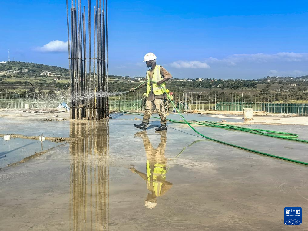 2月10日,在坦桑尼亞阿魯沙綜合體育場項目上,工人進行混凝土養(yǎng)護作業(yè)。新華社發(fā)(中國中鐵建工集團有限公司供圖)