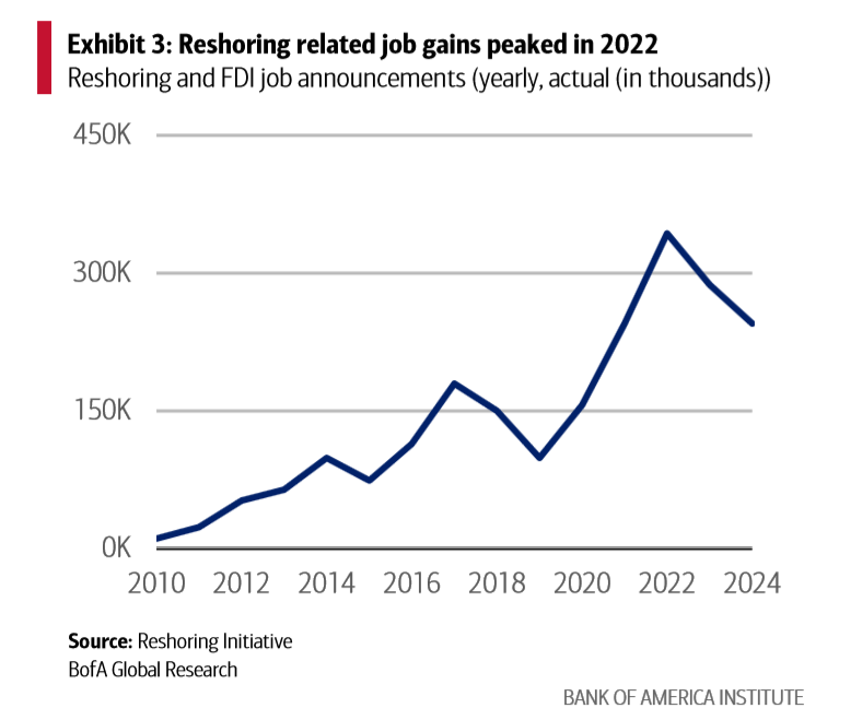 報告顯示,美國制造業(yè)回流創(chuàng)造的就業(yè)機(jī)會在2022年達(dá)到高峰后開始減少。