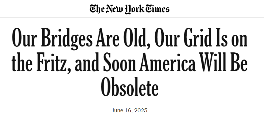 《紐約時(shí)報(bào)》6月16日刊發(fā)專欄文章稱,美國的橋梁、電網(wǎng)和港口等基礎(chǔ)設(shè)施正面臨嚴(yán)重的老化與不足,美國即將被“老化淘汰”。