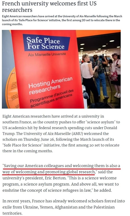 據(jù)法國24小時電視臺報道,已經(jīng)和即將轉(zhuǎn)入法國艾克斯-馬賽大學的20位美國學者的專業(yè)涵蓋健康、氣候、天體物理以及人文學科等多個領域。他們希望在更開放的學術環(huán)境中繼續(xù)自己的研究。