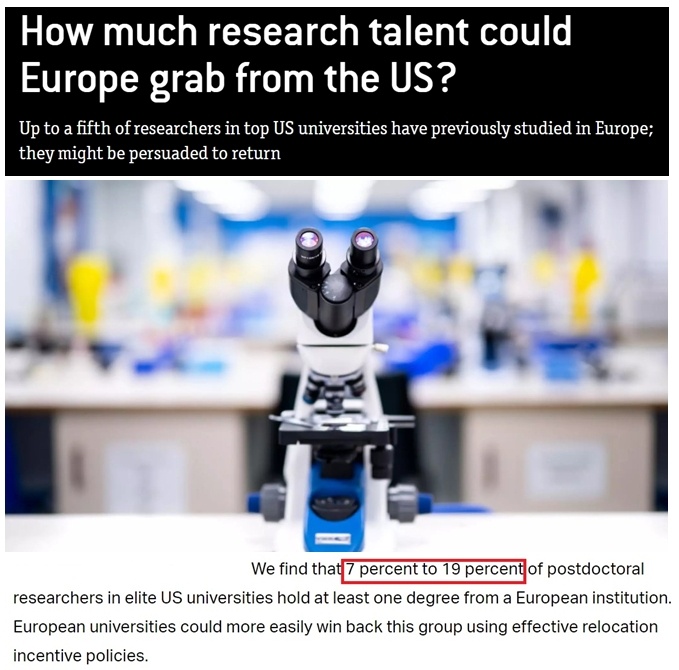 據(jù)歐洲知名智庫布魯蓋爾研究所分析,美國科研人員自身的教育背景可能成為他們未來選擇新工作場所的關鍵因素。
