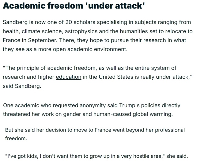 還有一位女學者告訴媒體,美國現(xiàn)政府的政策直接威脅到她有關氣候變暖等方面的研究工作,她搬到法國不僅是為了學術自由,還是因為不想讓自己的孩子“在一個充滿敵意的地方長大”。