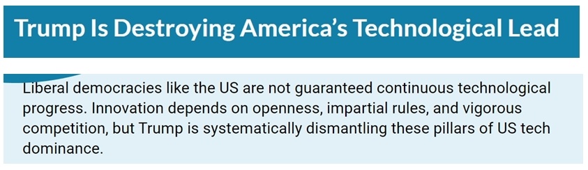 文章稱,研究機構、人才、資金等一直是支撐美國創(chuàng)新發(fā)展的重要支柱,而美國現(xiàn)政府正在系統(tǒng)性地拆除這些支柱,斷送自己的科技領先地位。