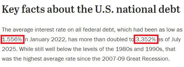 △美國(guó)皮尤研究中心的調(diào)查顯示,美聯(lián)邦債務(wù)的平均利率在美聯(lián)儲(chǔ)激進(jìn)加息前的2022年1月曾低至1.556%,而到今年7月已翻了一倍多,達(dá)到3.352%,也是自2007-2009年大衰退以來的最高平均利率水平。