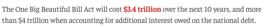 根據(jù)美國(guó)國(guó)會(huì)預(yù)算辦公室(CBO)上月做出的評(píng)估,“大而美”法案預(yù)計(jì)將在未來十年使美聯(lián)邦政府財(cái)政赤字增加約3.4萬(wàn)億美元;如果算上同期的額外美債利息,新增赤字更是將超過4萬(wàn)億美元。