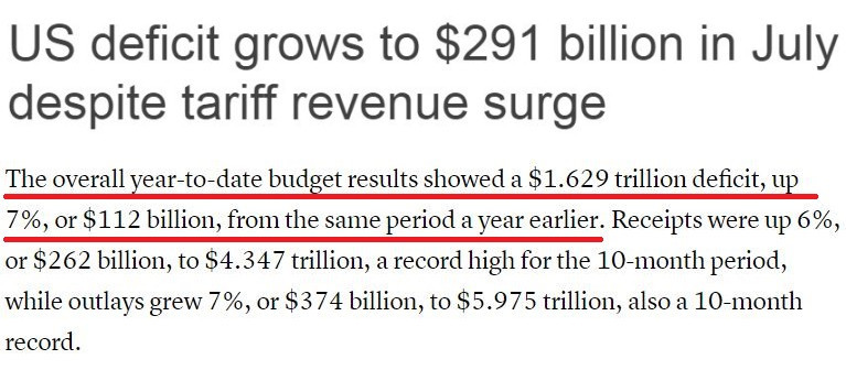 而從本財(cái)年(2024年10月1日至2025年9月30日)的整體情況來看,在截至7月的前十個(gè)月,美政府累計(jì)財(cái)政赤字已達(dá)1.63萬(wàn)億美元,同比增長(zhǎng)了7%。