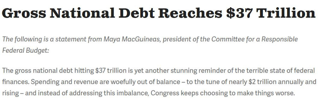 “(美國(guó))國(guó)家債務(wù)總額達(dá)到37萬(wàn)億美元的現(xiàn)實(shí)再次令人震驚地凸顯出聯(lián)邦財(cái)政的糟糕狀況。支出和收入嚴(yán)重失衡每年造成近2萬(wàn)億美元的財(cái)政赤字,然而美國(guó)國(guó)會(huì)不僅沒有解決這種財(cái)政失衡,反而一直選擇讓事情變得更糟。”