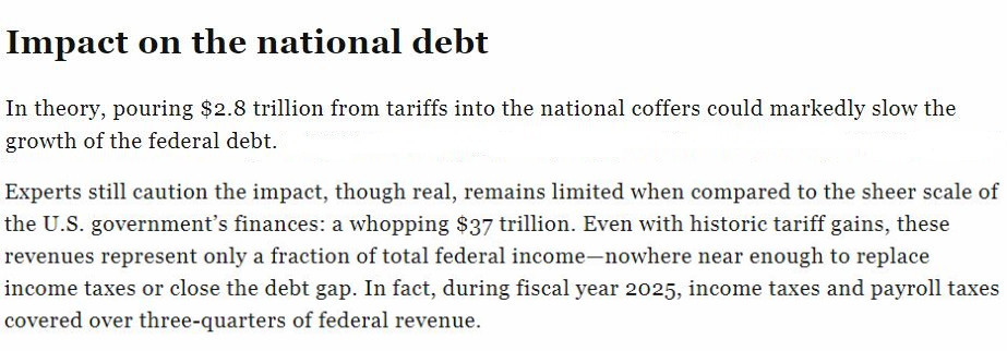 雖然美國(guó)政府確實(shí)從其濫施的關(guān)稅中“賺”了一筆,但專家們?nèi)匀痪嬷赋?,與37萬(wàn)億美元的龐大美債規(guī)模相比,關(guān)稅收入實(shí)屬九牛一毛。即使加上歷史上的關(guān)稅收益,它們也只占聯(lián)邦總收入的一小部分,遠(yuǎn)不足以取代所得稅或縮小債務(wù)缺口。