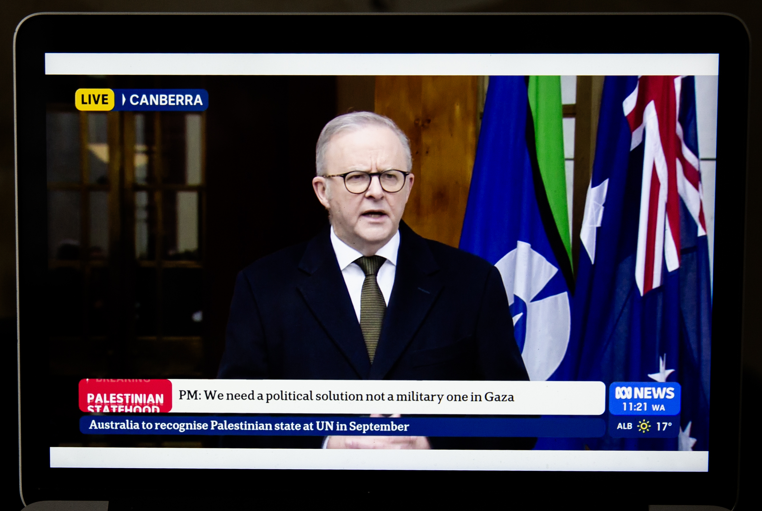 這是8月11日拍攝的澳大利亞總理阿爾巴尼斯在新聞發(fā)布會上講話的直播畫面。新華社記者馬平攝