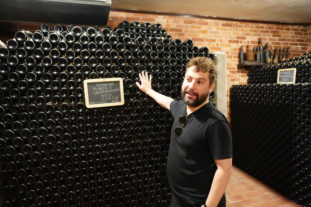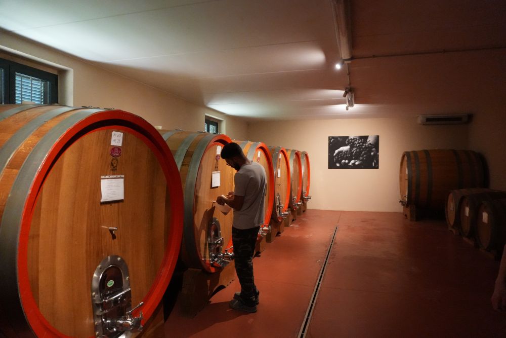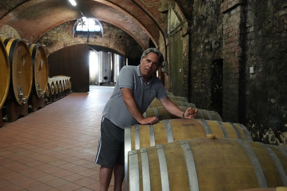 8月17日,在意大利拉莫拉鎮(zhèn),馬斯卡雷洛家族酒莊負責(zé)人法比奧·馬斯卡雷洛在酒窖里工作。新華社記者張馨文攝