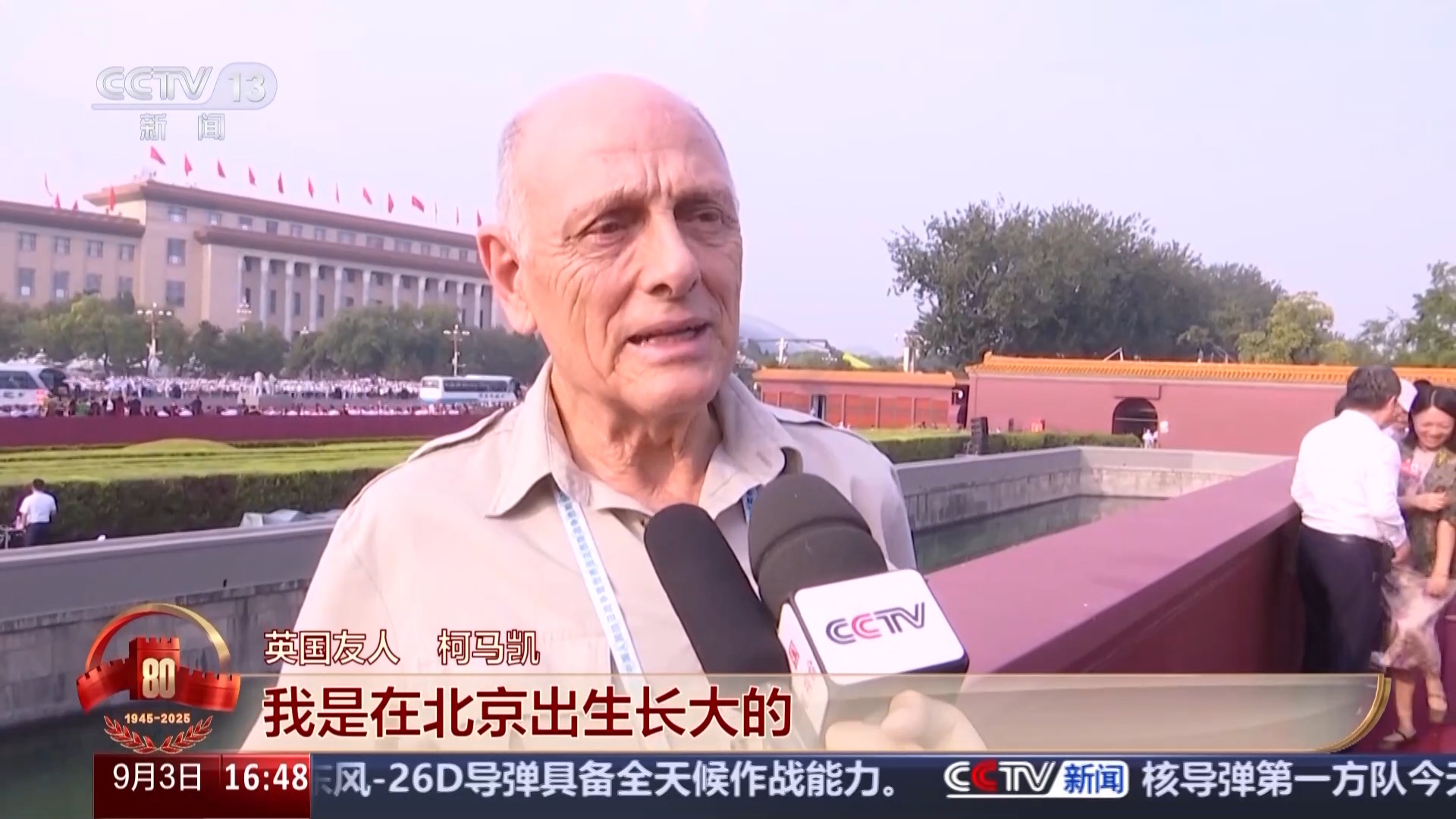 英國(guó)友人 柯馬凱:我是在北京出生長(zhǎng)大的,我多次到天安門廣場(chǎng)參加各種活動(dòng)。中國(guó)在國(guó)際上發(fā)揮的作用是幫助追求和平、阻止戰(zhàn)爭(zhēng),我覺得不像有些國(guó)家見了戰(zhàn)爭(zhēng)就得站隊(duì),而中國(guó)是去參與調(diào)停。和平發(fā)展是人民群眾最需要的。