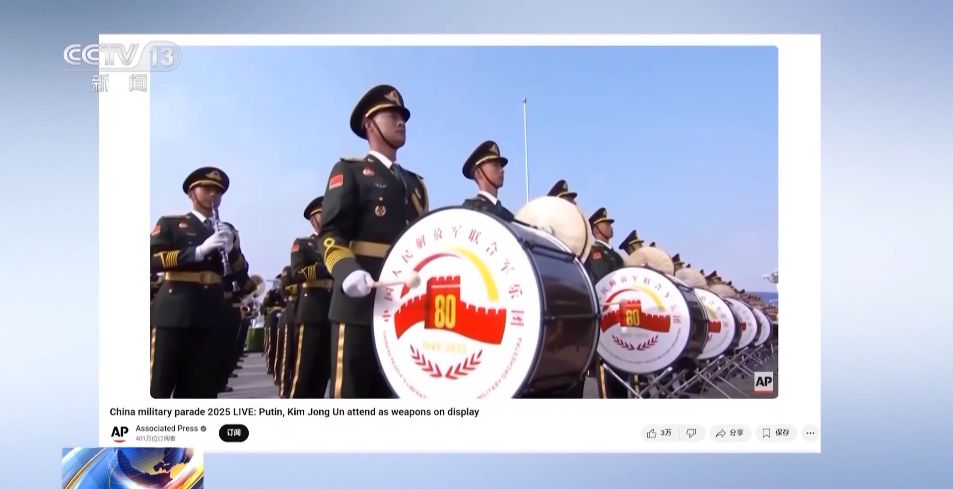 紀(jì)念中國(guó)人民抗日戰(zhàn)爭(zhēng)暨世界反法西斯戰(zhàn)爭(zhēng)勝利80周年大會(huì)3日隆重舉行。全球135個(gè)國(guó)家和地區(qū)的兩千多家電視臺(tái)和新媒體平臺(tái)通過(guò)中央廣播電視總臺(tái)的直播信號(hào)關(guān)注這一重大事件。